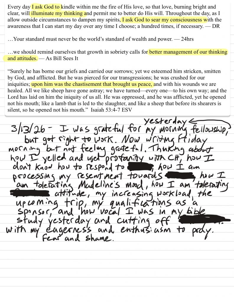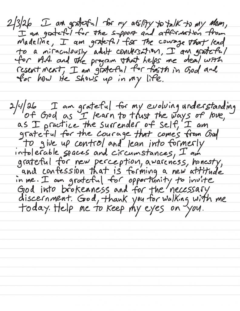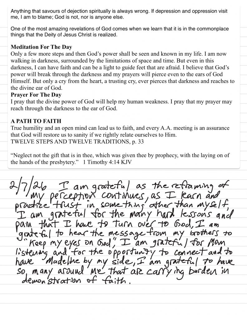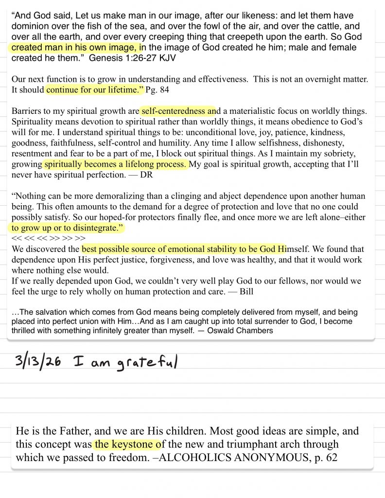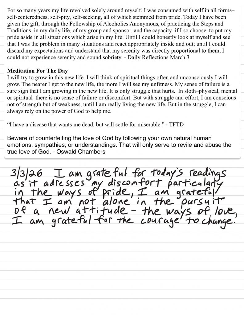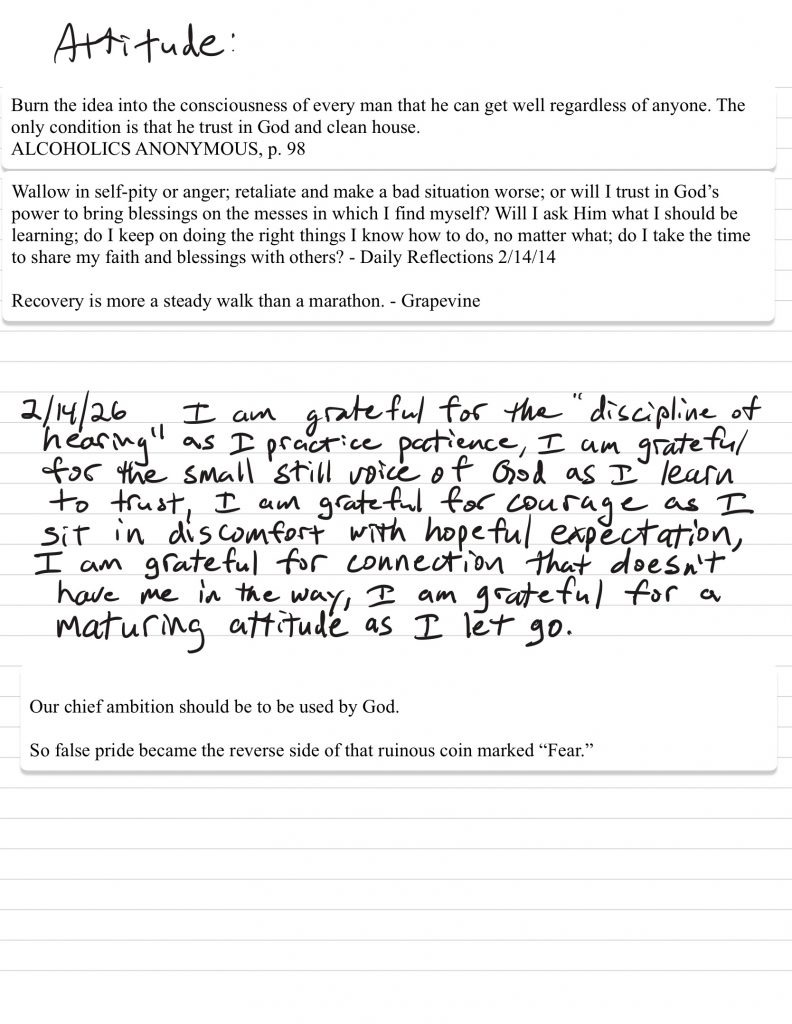 • I work to monitor my attitude to maintain gratitude and humility and ask God for help to remain in that posture, I discuss my challenges with loved ones prayerfully and use writing and grounding/meditation tools when necessary.