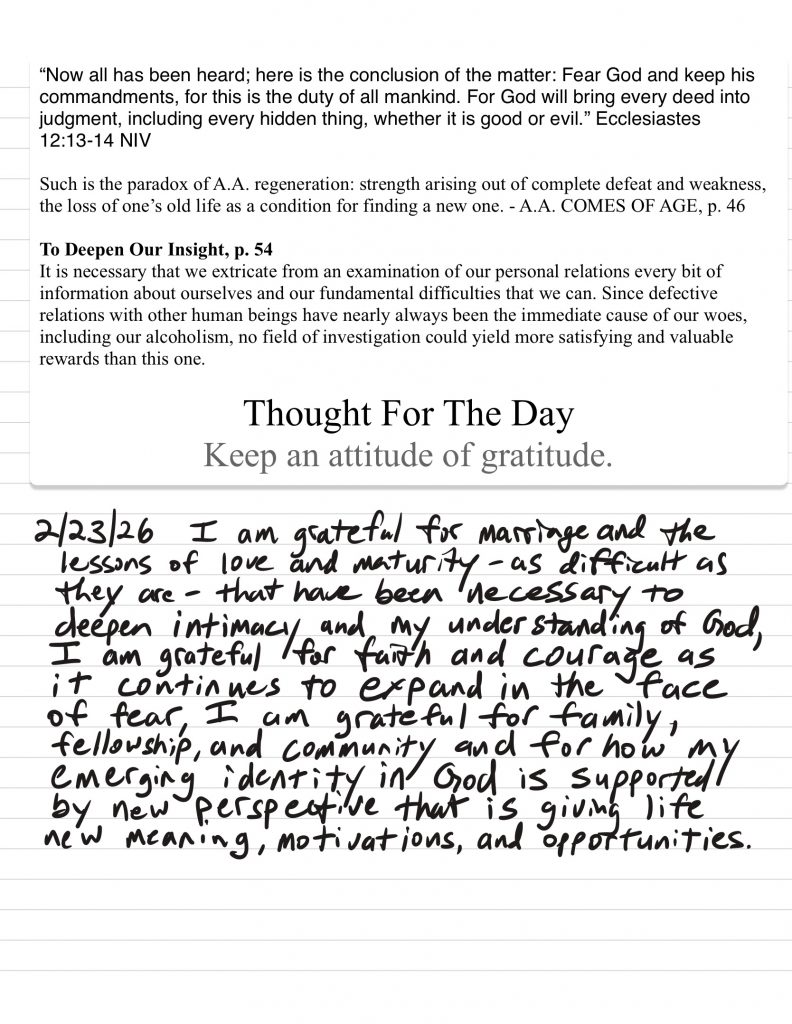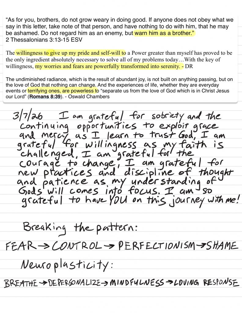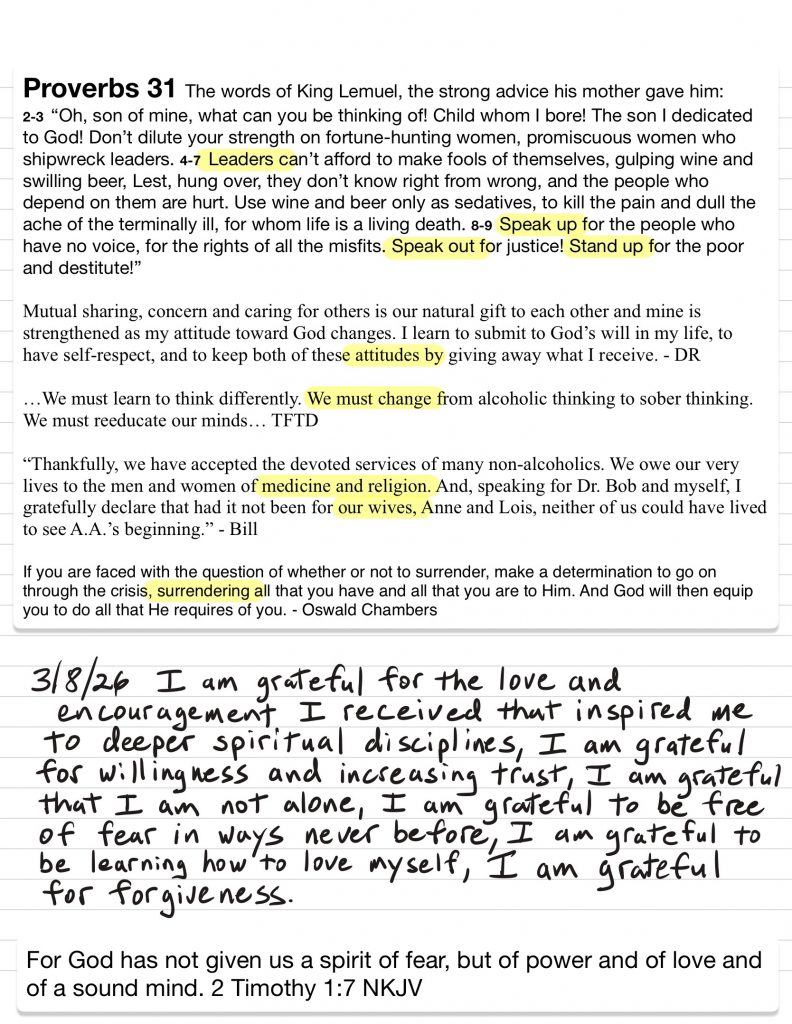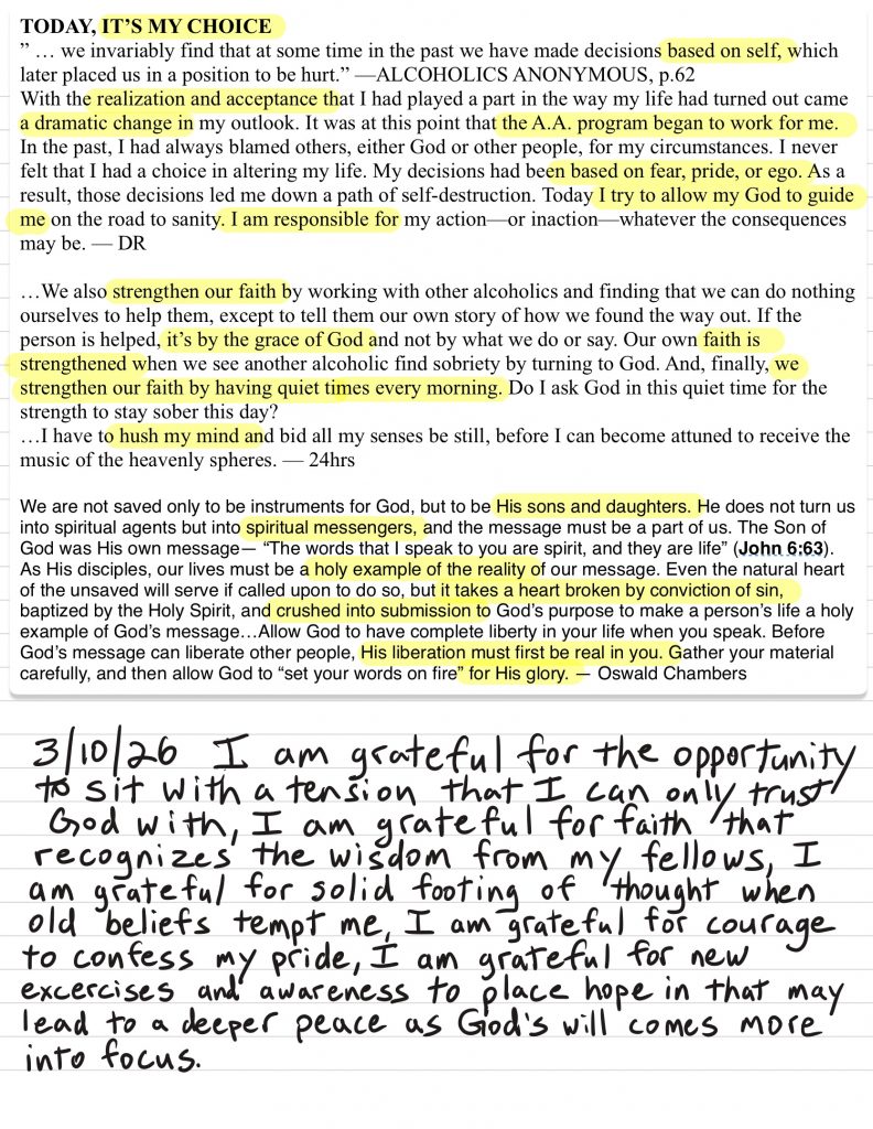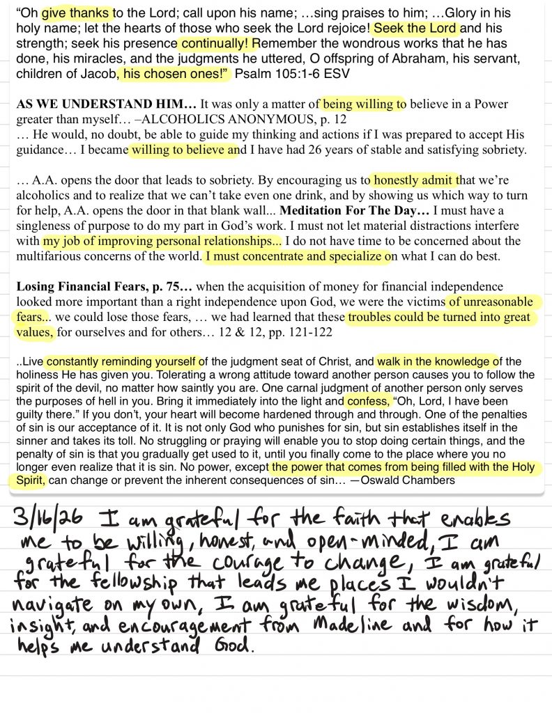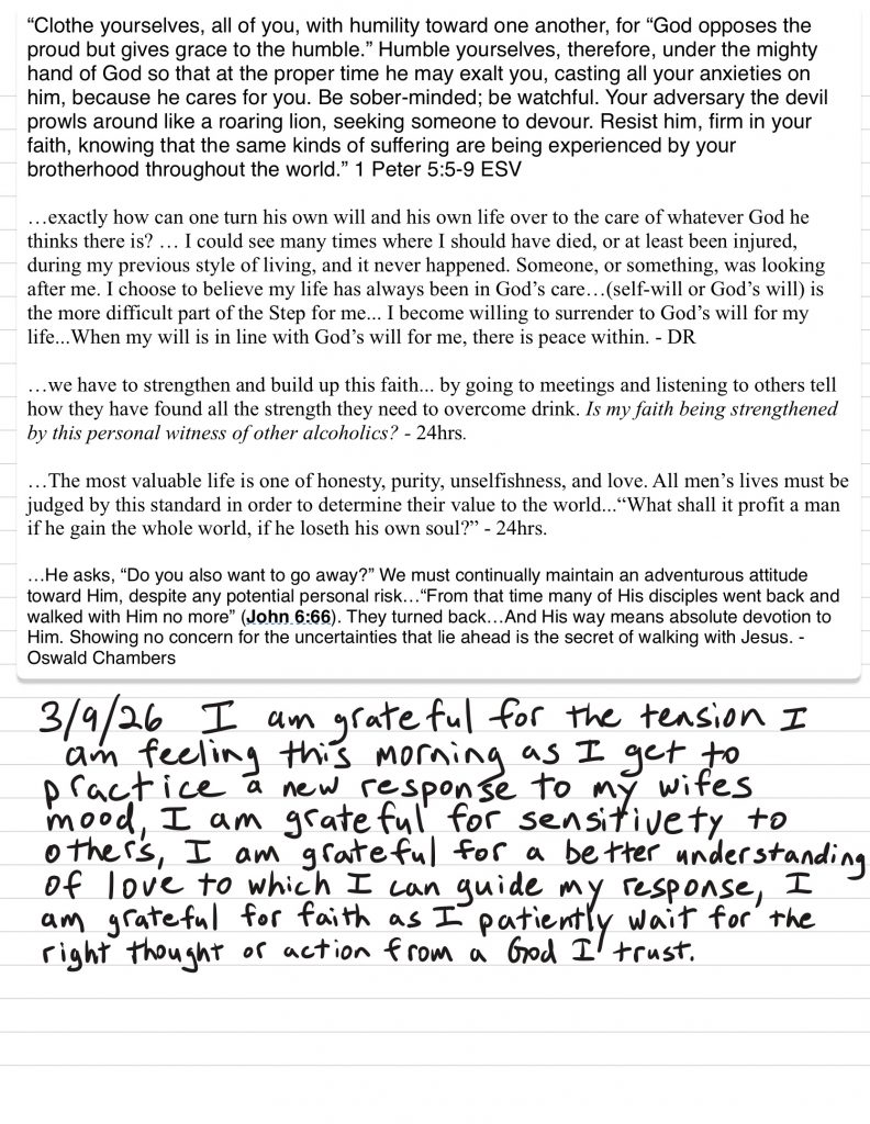 • I work to monitor my attitude to maintain gratitude and humility and ask God for help to remain in that posture, I discuss my challenges with loved ones prayerfully and use writing and grounding/meditation tools when necessary.
