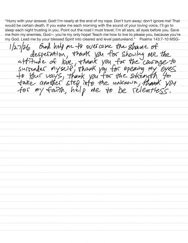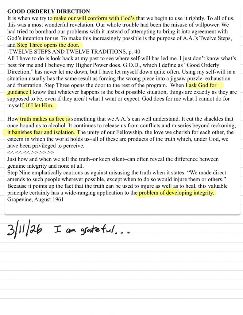 “God, please direct my thinking, especially that it be divorced from self-pity, dishonest, and self-seeking motives. Show me throughout the day what my next step will be. Give me whatever I need to take care of whatever problems I may face. Help me especially, Lord, to be free from self-will. God, show me the way of patience, tolerance, kindness, and love. Save me from being angry. Please remove fear from me and direct me to what you would have me be. How can I be helpful to others? I pray for the willingness to be willing. God, I offer myself to you – to build with me and to do with me as you will. Relieve me of the bondage of self, that I may better do your will. Take away my difficulties, that victory over them may bear witness to those I would help of Your Power, Your Love, and Your Way of life. May I do Your will always. God, take me in. Be the focus of my heart and mind. Please help me to renew myself. I know you will never fail me. My Creator, I am now willing that you should have all of me – good and bad. I pray that you now remove from me every single defect of character which stands in the way of my usefulness to you and my fellows. Grant me strength Lord, as I go out from here, to do your bidding. Amen.”